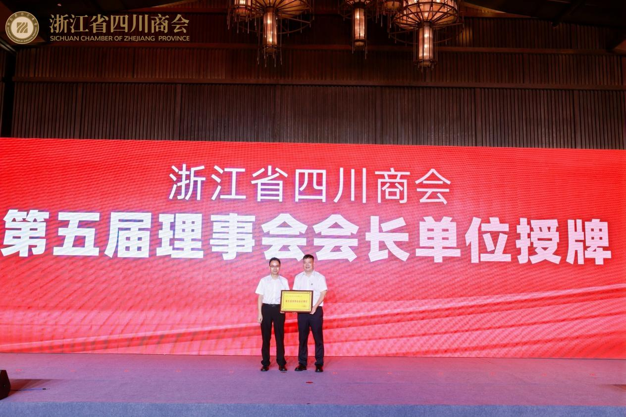 四川省人民政府驻上海办事处经济合作处四级调研员代鹏,浙江省四川商会执行会长赵崇甫为商会第五届理事会理事单位授牌
