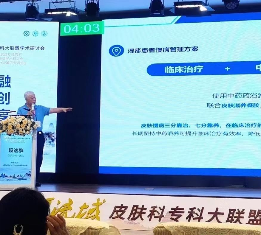 全体大会环节星光璀璨,众多学者作主旨报告。值得一提的是,中华中医药学会皮肤科分会名誉主委、湖南中医药大学第二附属医院主任医师杨志波教授;中华中医药学会皮肤科分会第一、二届主任委员、武汉市第一医院首席专家段逸群教授分别对特应性皮炎、银屑病、慢性湿疹的管理方案进行了解析。皮肤科慢病管理原则:三分靠治、七分靠养;皮肤科慢病管理方案:临床治疗+中药浴养。