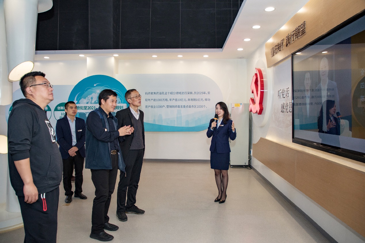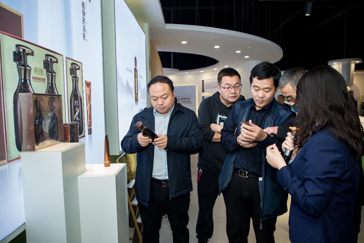 朗佑堂总经理吴苗苗陪同中国林业与环境促进会张鑫副主席一行参观朗佑堂文化展厅,介绍朗佑堂沐耄舒、沐足舒、沐发舒、沐圣舒、沐童舒等药浴乳系列产品。