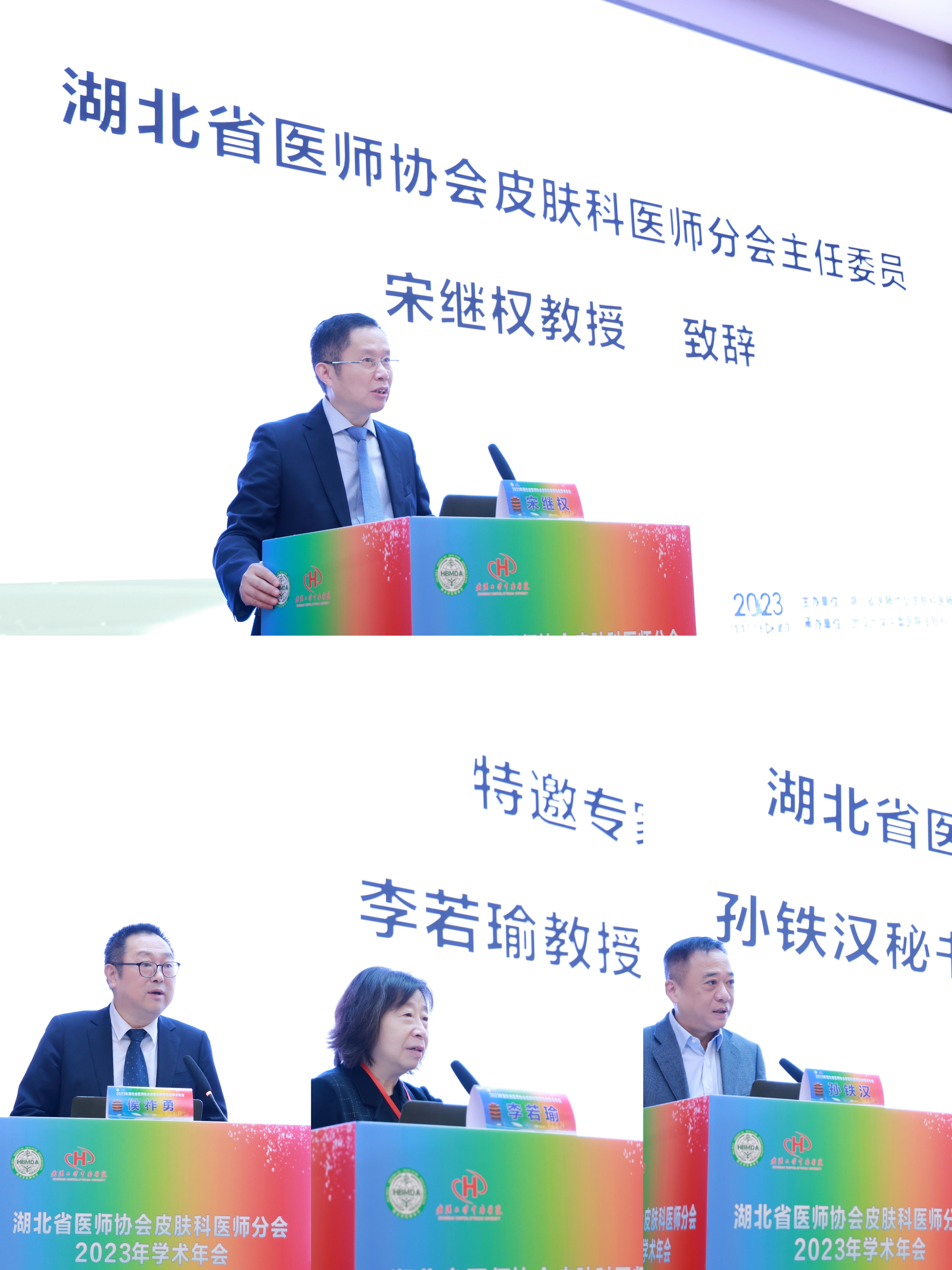 大会伊始,武汉大学中南医院皮肤科主任、湖北省医师协会皮肤科医师分会主任委员宋继权教授致辞。他表示,此次年会旨在聚焦和传播最前沿的皮肤科理论与技术,加强和与提升皮肤科同行之间的沟通与合作。大家共同推动学科的交流与发展,为广大的皮肤科同仁搭建一个高水平的平台。 随后,武汉大学中南医院党委副书记侯祚勇教授、北京大学第一医院李若瑜教授、湖北省医师协会孙铁汉秘书长分别为大会致开幕辞。