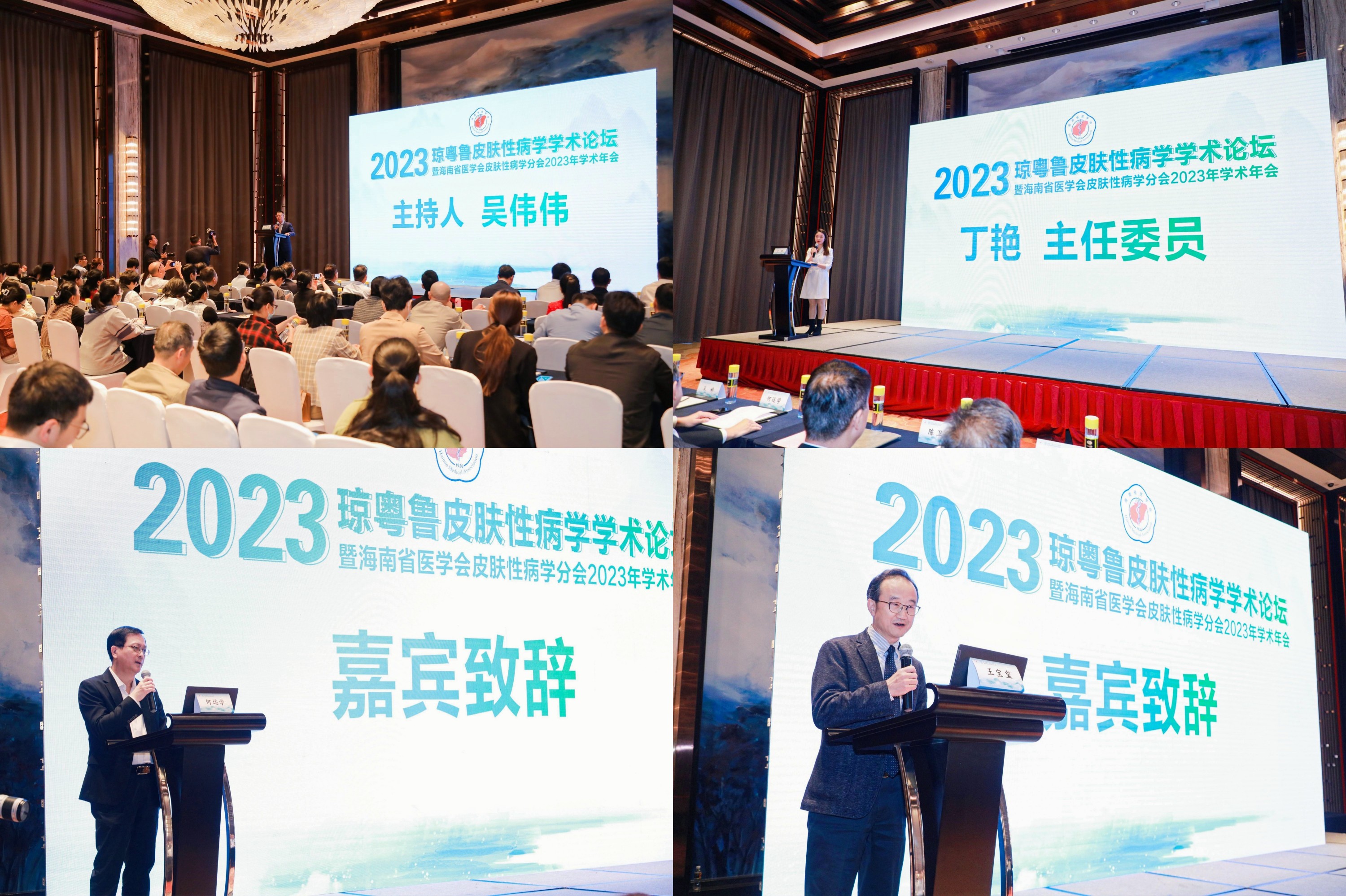 大会于11月18日早上9点正式开幕,开幕式由海南省第五人民医院副院长吴伟伟主持。海南省医学会皮肤性病学分会主任委员丁艳上台发言,对各位皮肤科同道与所有参会人员的到来表示热烈欢迎并预祝大会圆满成功。随后,海南省医学会副会长兼秘书长何远学、中国医学科学院整形外科医院党委书记王宝玺分别为大会做精彩致辞。