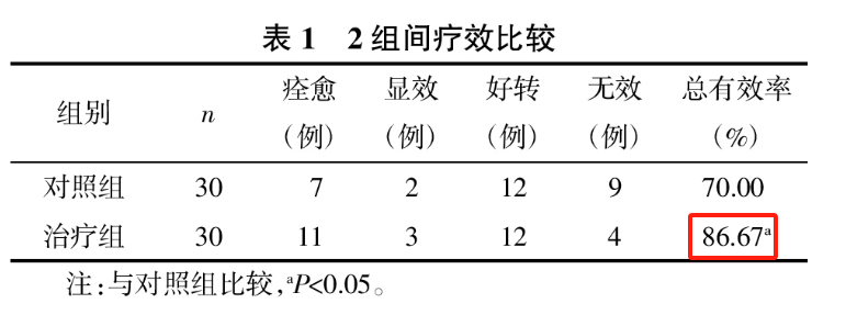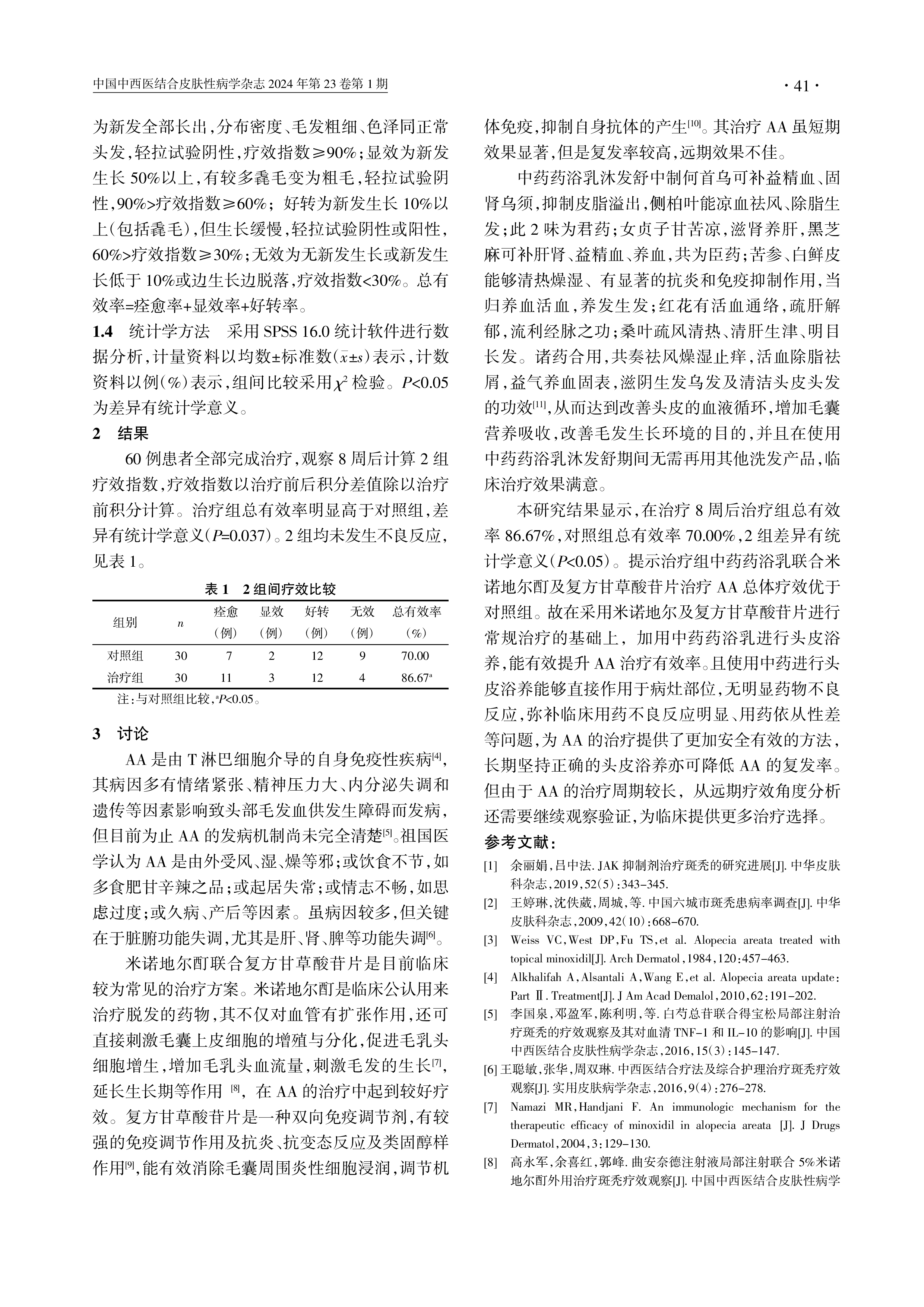 临床观察结论:外洗中药药浴乳沐发舒联合外喷米诺地尔酊及口服复方甘草酸苷片治疗斑秃(Alopecia areata,AA),其疗效确切,总有效率从70%提升至86.67%,适合临床推广。