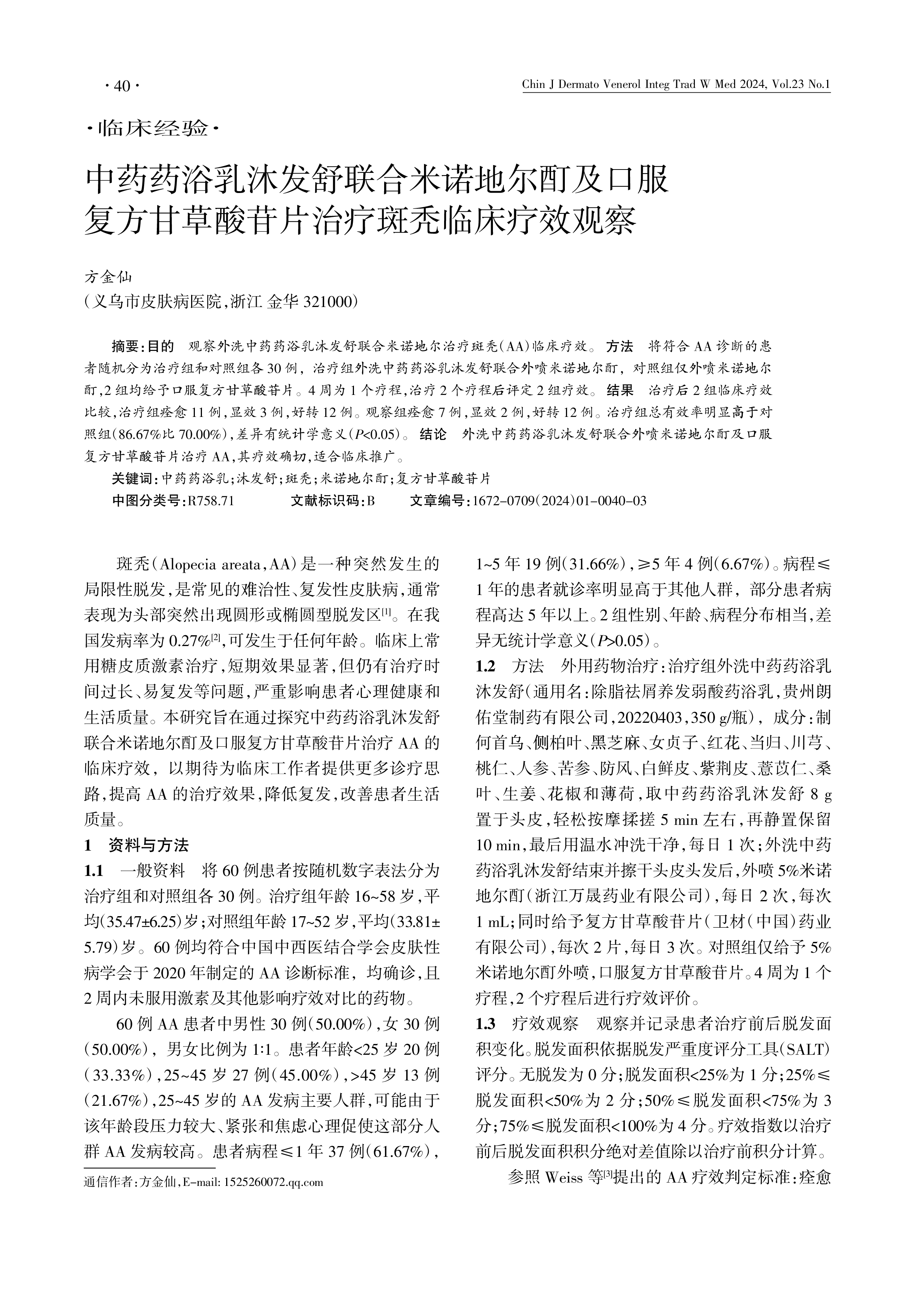 近期,中国科技论文统计源期刊、中国科技核心期刊《中国中西医结合皮肤性病学杂志》2024年2月第23卷第1期发表了中药药浴乳循证医学论文《中药药浴乳沐发舒联合米诺地尔酊及口服复方甘草酸苷片治疗斑秃临床疗效观察》,为斑秃人群(Alopecia areata,AA)选择“临床治疗+中药浴养”来提高斑秃(AA)的治疗效果、降低复发,提供较强的临床指导。