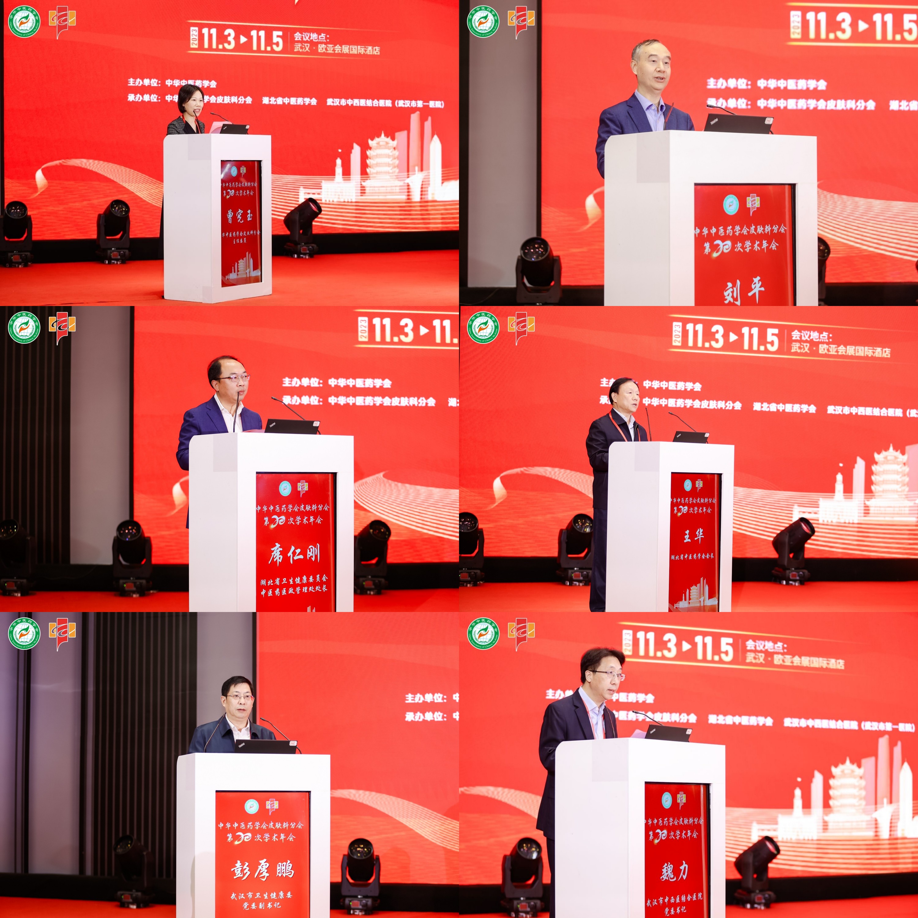 大会于11月4日早8:30正式开幕,开幕式采用了线下结合网络客户端线上直播的方式进行盛大直播,中华中医药学会皮肤科分会主任委员曾宪玉教授、中华中医药学会原副秘书长刘平先生,湖北省卫生健康委员会中医药医政管理处处长席仁刚先生,湖北省中医药学会会长王华教授,武汉市卫生健康委员会党委副书记彭厚鹏先生,武汉市中西医结合医院党委书记魏力教授等为大会做精彩致辞。