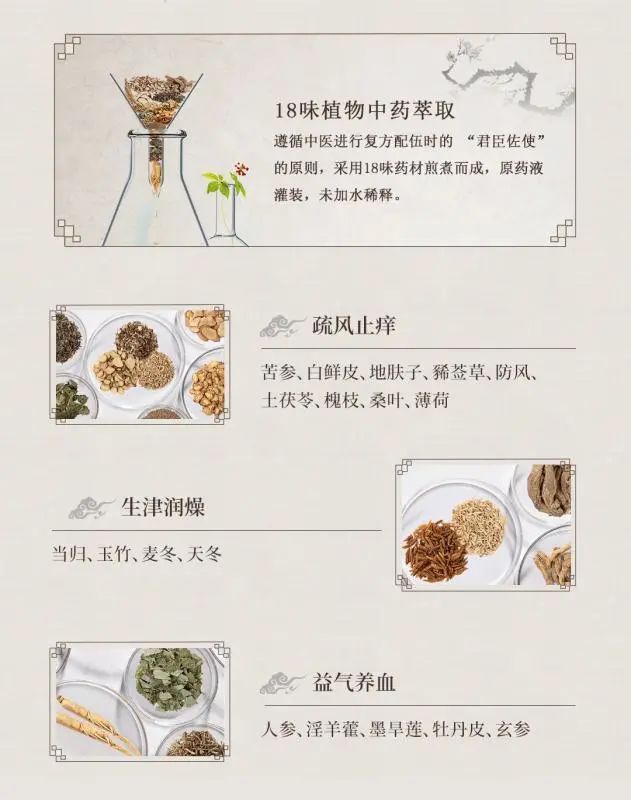 18味植物中药萃取而成原药液灌装,未加水稀释,具有益气养血、润燥祛屑、疏风止痒、修复皮肤屏障以及清洁皮肤的保健功效,专业解决中老年人皮肤干痒问题。